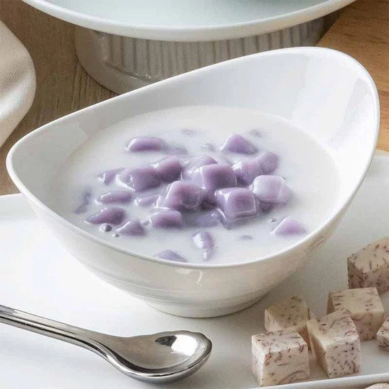 Bua Loi is a Thai dessert. It consists of Glutinous rice flour rolled into small balls, and cooked in coconut milk sugar a hint of salt. We mixed taro and purple yam flavour.