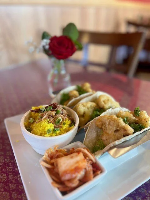Soft shell Corn Tortilla with crunchy cauliflower, pickle daikon, lettuce, cabbage with peanut dressing sauce with a side of turmeric rice and kimchi. Topped with green onion, fried shallot and Jalapeno.